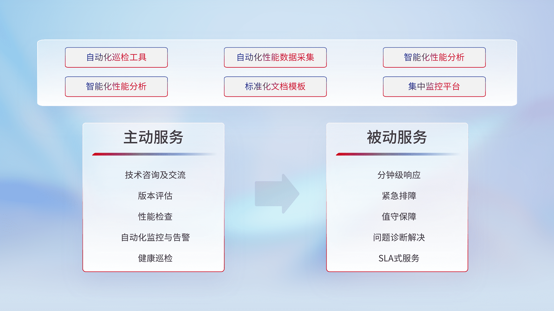 智能化工具和标准化文档,,保障服务质量,,,提供主动服务(包含技术咨询、、、、版本评估、、性能检查、、、、自动化监控与告警、、、健康巡检)和被动服务包含(分钟级响应、、紧急排障、、、值守保障、、、问题诊断解决、、、、SLA服务)。。。